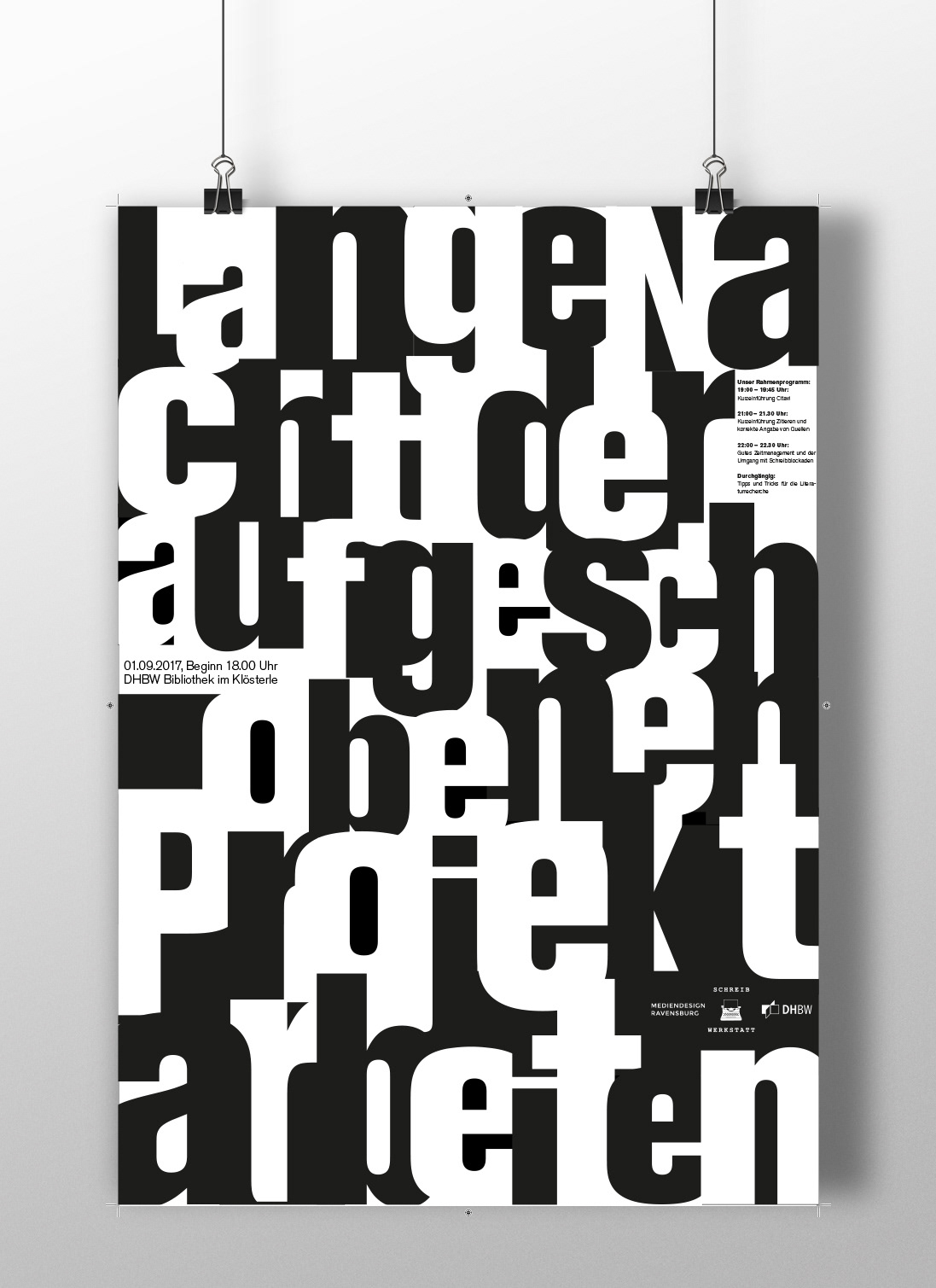 Für die Schreibwerkstatt der DHBW Ravensburg wurde eine Plakatserie entwickelt, indem mit den Weißräumen der verschiedenen Buchstaben gespielt wird. So entsteht ein spannendes typografisches Zusammenspiel zwischen schwarz und weiß.